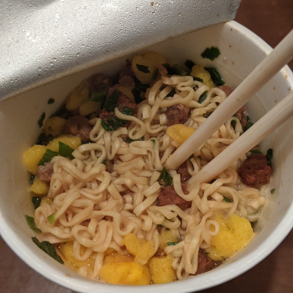 The second time around, the following day in fact, I was able get through the noodles burn free. They were soy sauce flavour, about as regular and standard a flavour of cup noodles you can get. It tasted of quite literally what it said on the cup, of soy sauce. I like to imagine there’s a group of scientists in some hidden away lab tasked with making the perfect little mix of powder for these noodles; the brown-ish dust that gives you nothing less but certainly nothing more than what you expected.